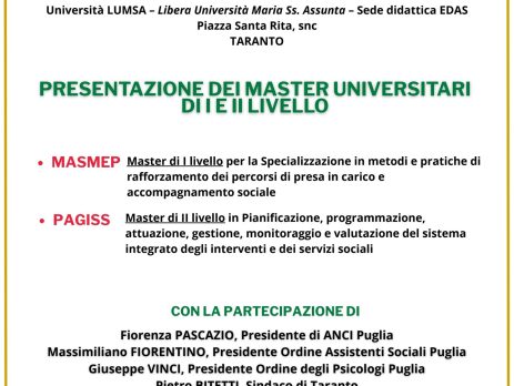 Oggi lunedì 17 novembre 2025 si terrà presso l’Università LUMSA di Taranto, la Presentazione dei Master Universitari di I e II livello interamente finanziati dal Ministero del Lavoro e delle Politiche Sociali, totalmente gratuiti. MASMEP: Master di I livello per la Specializzazione in metodi e pratiche di rafforzamento dei percorsi di presa in carico e accompagnamento sociale.