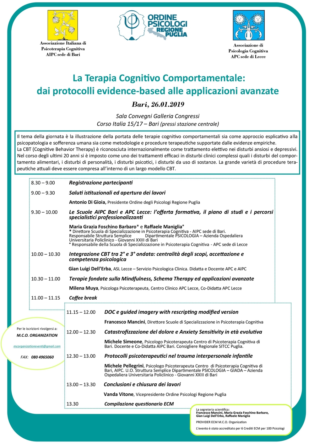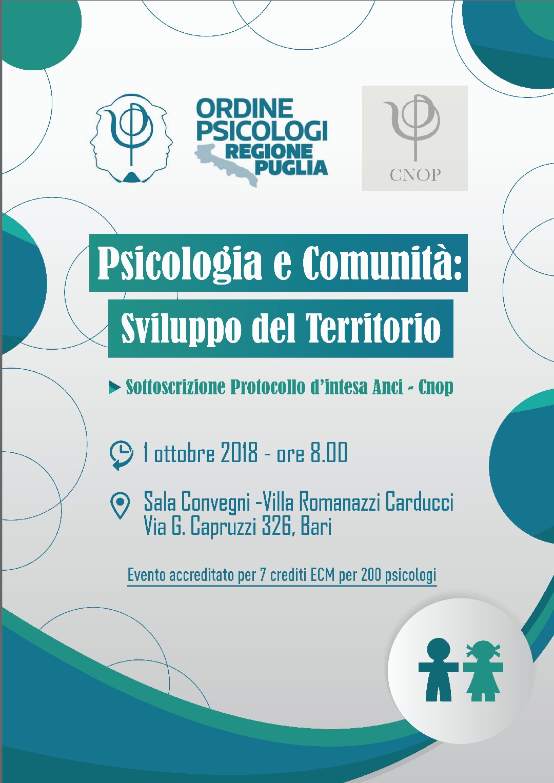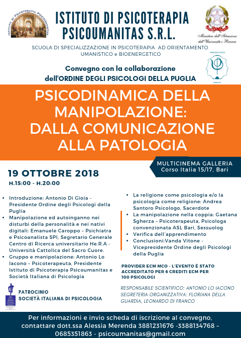 Convegno organizzato dall’Ordine degli Psicologi della Regione Puglia in collaborazione con l’Istituto di Psicoterapia Psicoumanitas, previsto per il 19 ottobre, ore 15:00-20:00, presso il Multicinema …