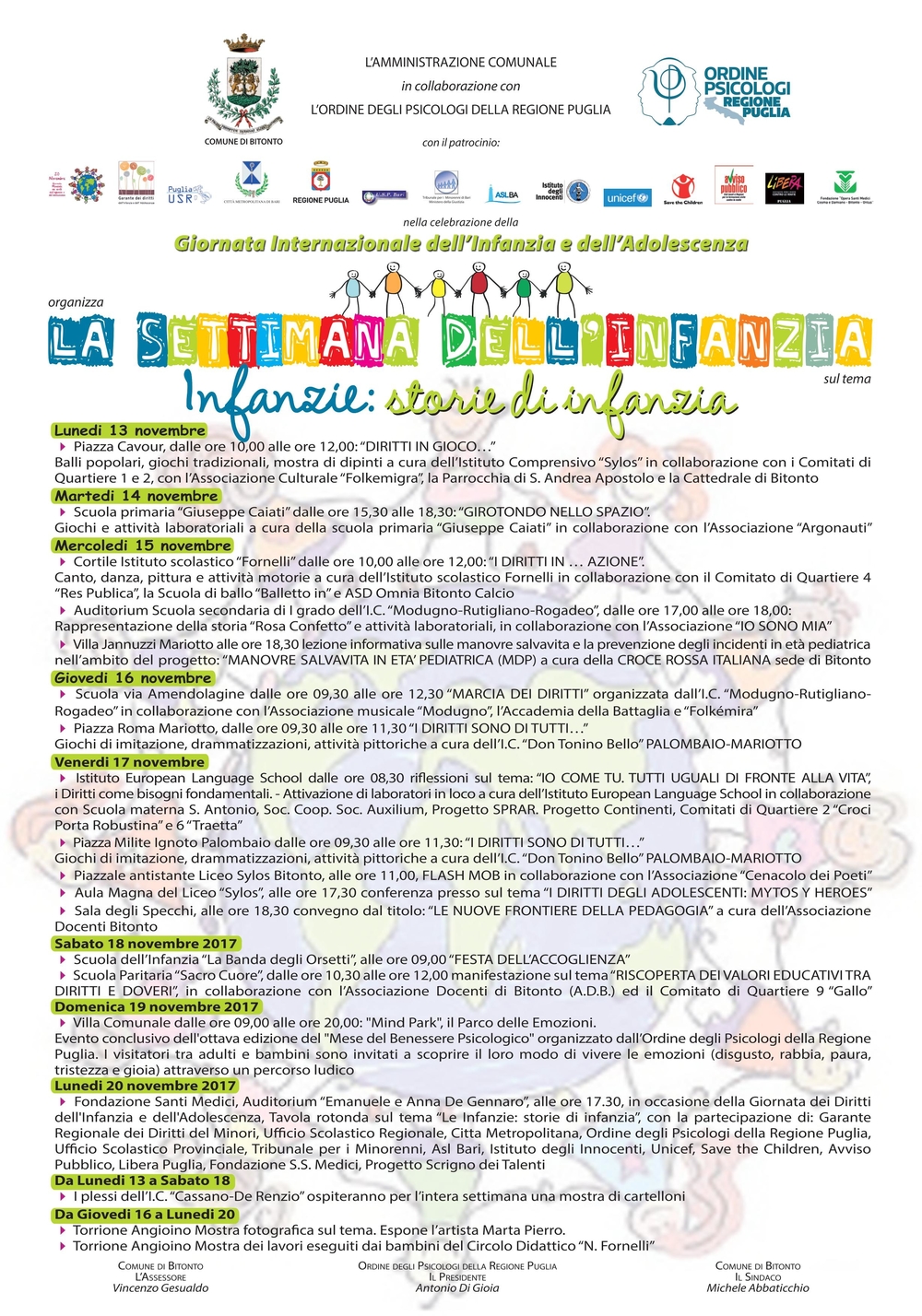 Il Comune di Bitonto in collaborazione con l’Ordine degli Psicologi di Puglia, in occasione della Giornata dell’Infanzia e dell’Adolescenza, organizza La Settimana dell’Infanzia, dal 13 …