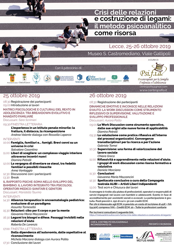 Vi invitiamo il 25 e il 26 ottobre 2019 al convegno dal titolo: “Crisi delle relazioni e costruzione di legami: il metodo psicoanalitico come risorsa”, …