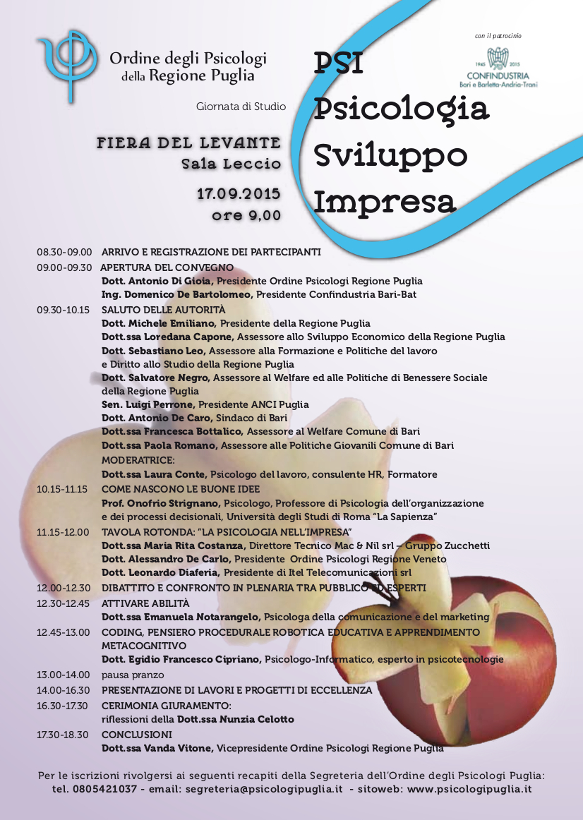 “Psicologi, Sviluppo, Impresa” è il titolo del convegno in programma per il 17 settembre presso la Sala Leccio del quartiere fieristico della Fiera del Levante. …
