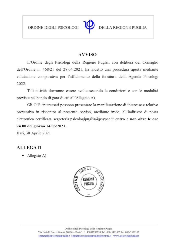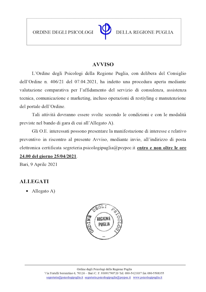 L’Ordine degli Psicologi della Regione Puglia, con delibera del Consiglio dell’Ordine n. 406/21 del 07.04.2021, ha indetto una procedura aperta mediante valutazione comparativa per l’affidamento …