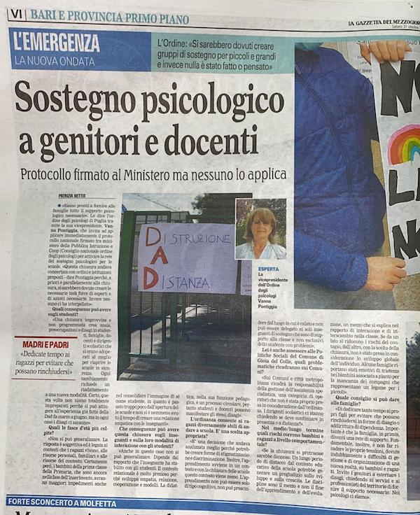 Articolo de La Gazzetta del Mezzogiorno: Sostegno Psicologico a genitori e docenti – 31/10/2020