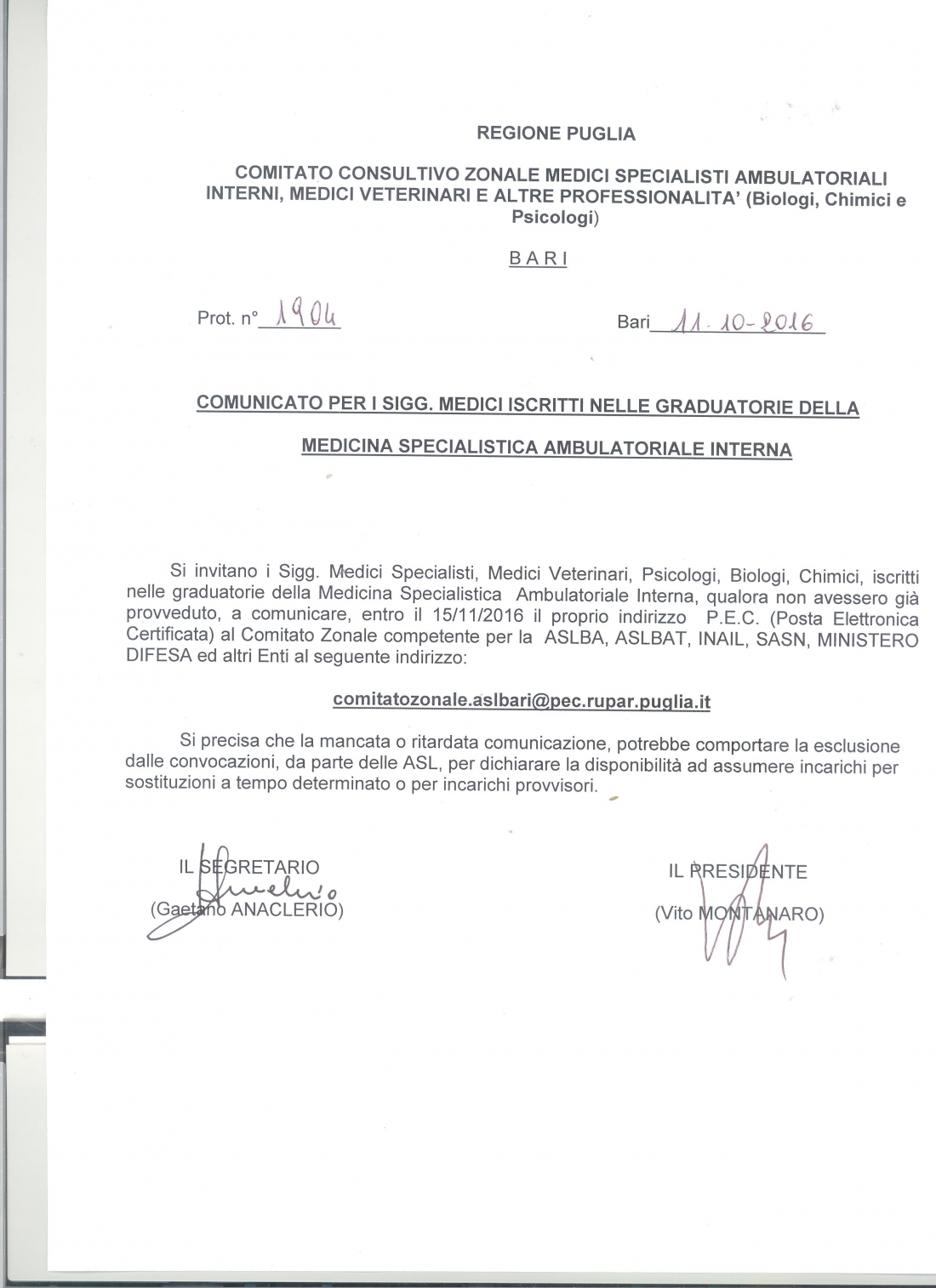 Chiarimenti del Presidente sui requisiti per l’inclusione nelle graduatorie degli Psicologi ambulatoriali delle Asl
