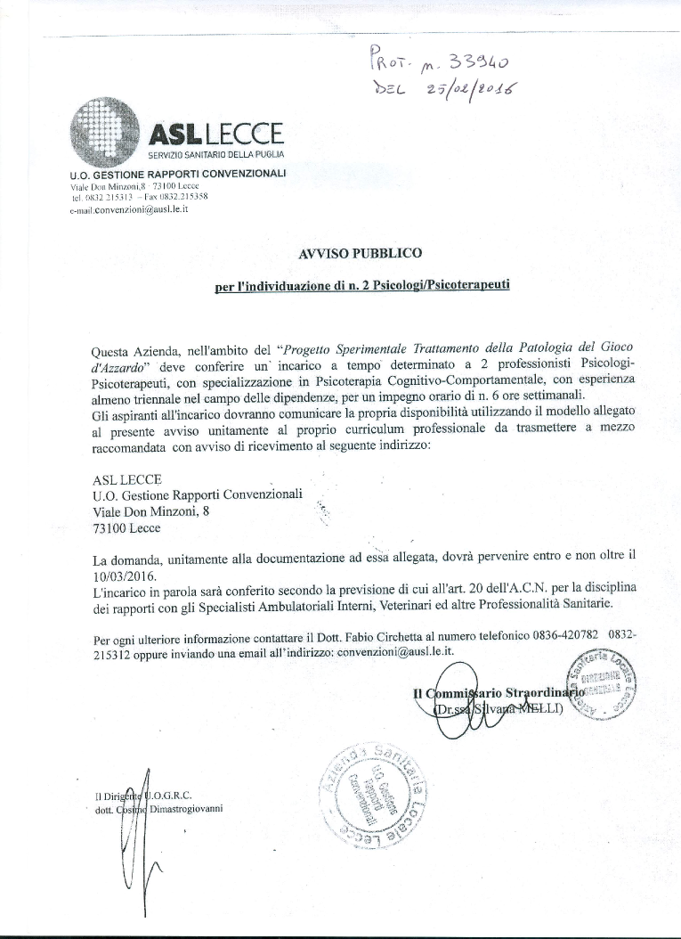 In allegato il modulo di disponibilità e l’avviso pubblico per l’individuazione di n.2 Psicologi/Psicoterapeuti per l’ASL di Lecce.
