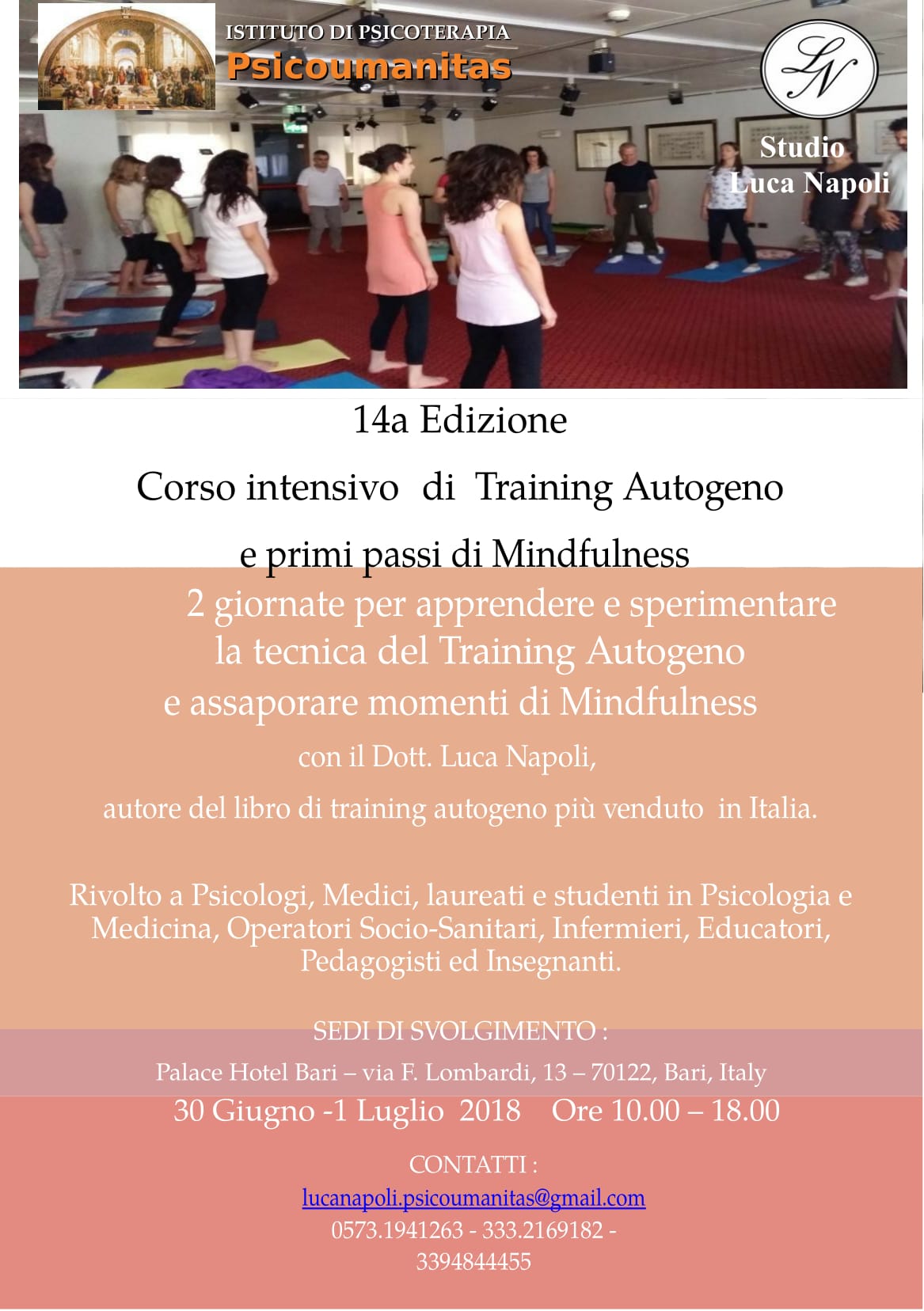 L’Ordine degli Psicologi della Regione Puglia ha stipulato un accordo di convenzione con la Scuola di specializzazione in psicoterapia umanistica e bioenergetica, sede di Taranto avente per oggetto la 14^ edizione del “Corso intensivo di Training Autogeno e Mindfulness” organizzata dal dott. Luca Napoli.