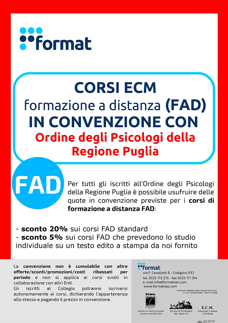 l’Ordine degli Psicologi della Regione Puglia ha stipulato una convenzione gratuita con la piattaforma FORMAT per garantire ai suoi iscritti la partecipazione ai corsi ECM FAD (Formazione A Distanza) in partenza nel periodo corrente.