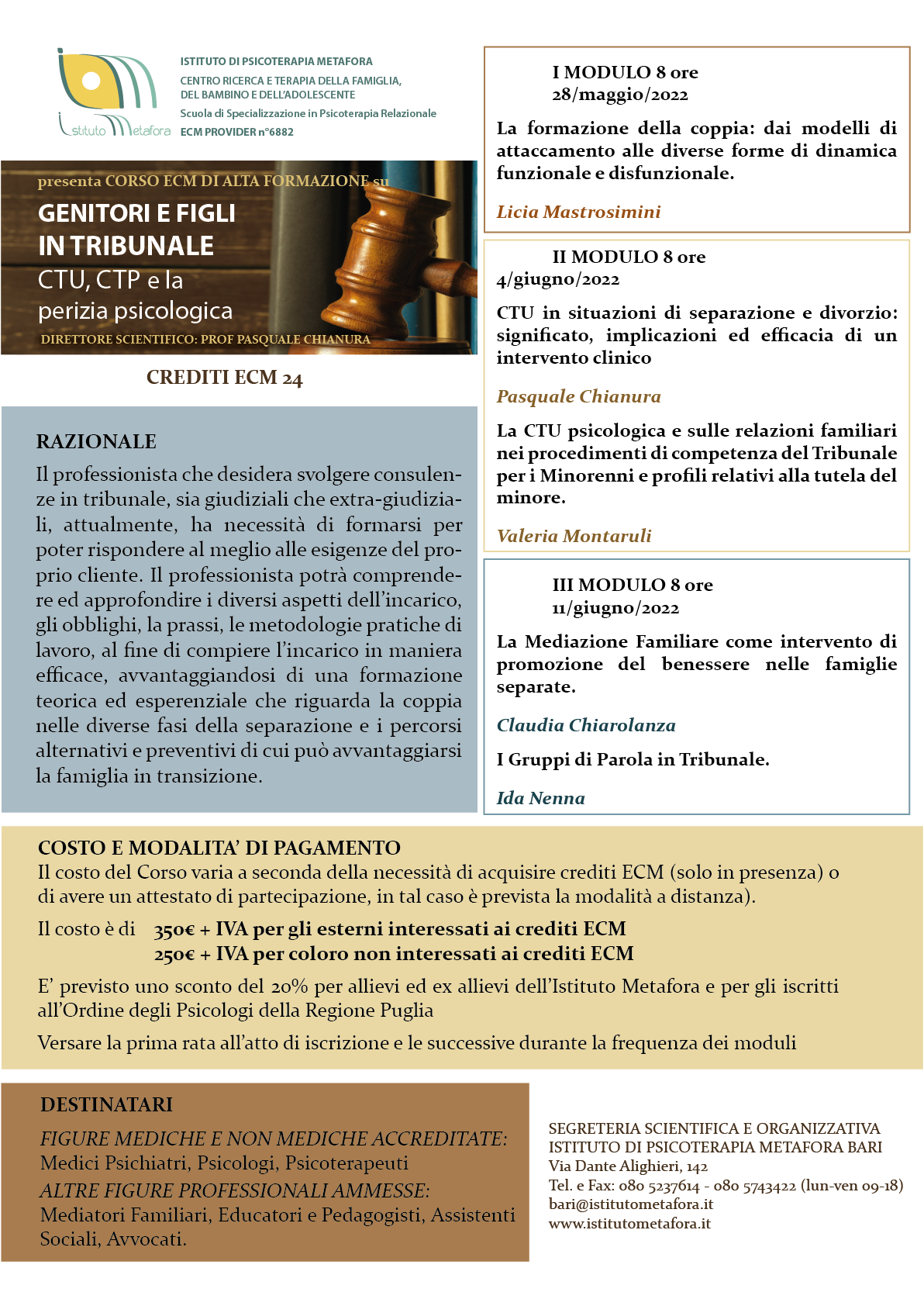 L’Ordine degli Psicologi Regione Puglia ha stipulato una Convenzione con il Corso di Alta Formazione: Genitori e figli in Tribunale CTU,CTP e la perizia psicologica. ECM 24, organizzato dall’Istituto Metafora.