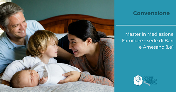 L’Ordine degli Psicologi Regione Puglia ha stipulato una Convenzione con il Master in Mediazione Familiare – sede di Bari e Arnesano (Le), per gli iscritti all’Ordine è previsto uno sconto del 20% sul prezzo al pubblico.