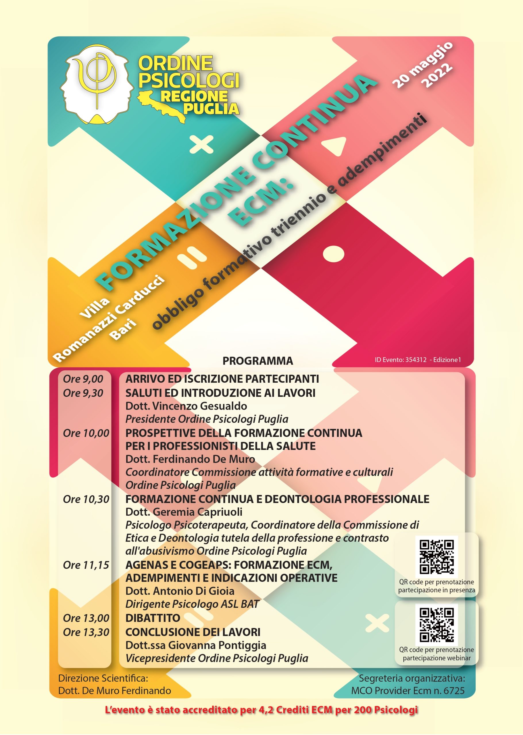 ho il piacere di invitarti al Convegno organizzato dall’Ordine degli Psicologi della Regione Puglia, sul tema “FORMAZIONE CONTINUA ECM: OBBLIGO FORMATIVO TRIENNIO E ADEMPIMENTI ”.