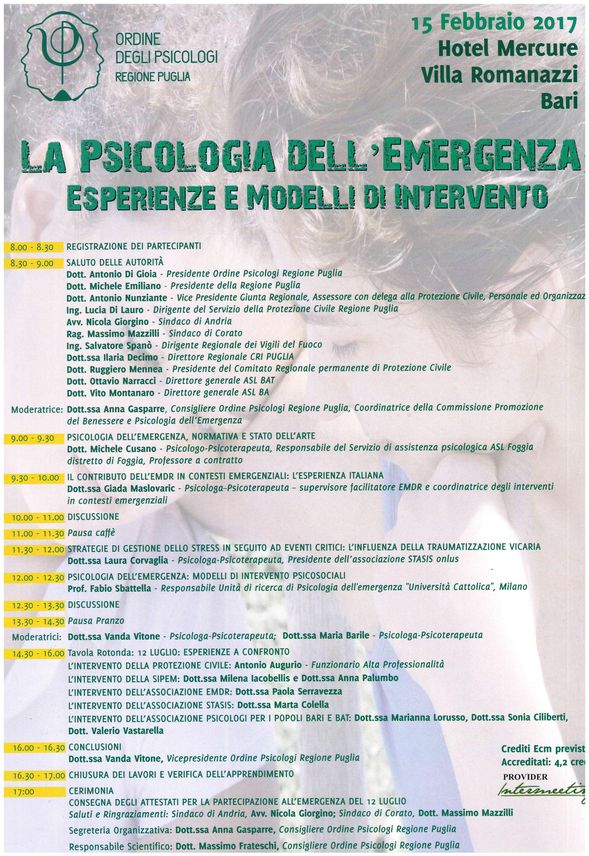 ho il piacere di invitarti al Convegno organizzato dall’Ordine degli Psicologi della Regione Puglia sul tema “LA PSICOLOGIA DELL’EMERGENZA: ESPERIENZE E MODELLI DI INTERVENTO”.