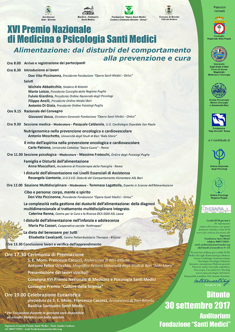 Segnaliamo il presente convegno organizzato nell’ambito del XVI Premio Nazionale di Medicina e Psicologia che si terrà il 30 SETTEMBRE 2017 a Bitonto.