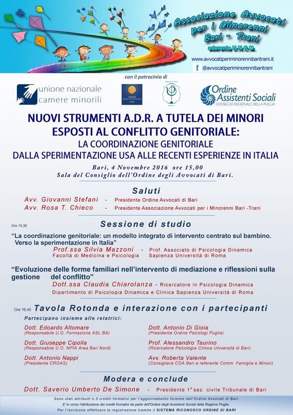 “Nuovi strumenti A.D.R. a tutela dei minori esposti al conflitto genitoriale” è il titolo dell’evento in programma a Bari, ore 15,00, presso la Sala del Consiglio dell’Ordine degli Avvocati di Bari.