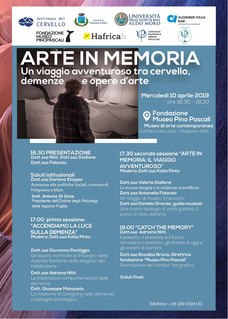 Il 10 aprile, dalle 16:30 alle 18:30, presso la Fondazione Museo Pino Pascali di Polignano (BA) in via Parco del Lauro n°119, si svolgerà l’evento “Arte in memoria. Un viaggio avventuroso tra cercello, demenze e opere d’arte” patrocinato dall’Ordine degli Psicologi della Regione Puglia.