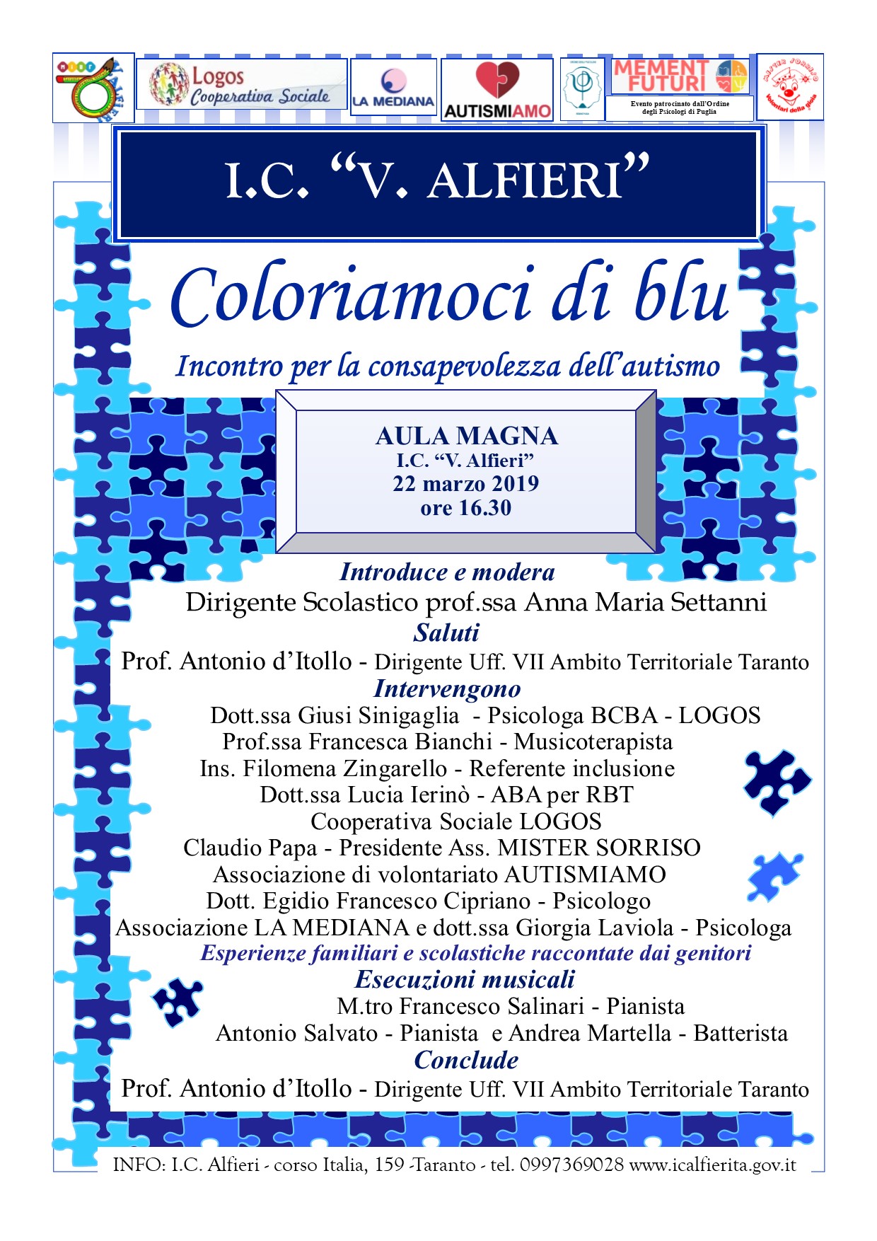 Venerdì 22 marzo, a partire dalle ore 16:30, si svolgerà l’evento patrocinato dall’Ordine degli Psicologi della Regione Puglia dal titolo “Coloriamoci di blu – Incontro per la consapevolezza dell’autismo”,