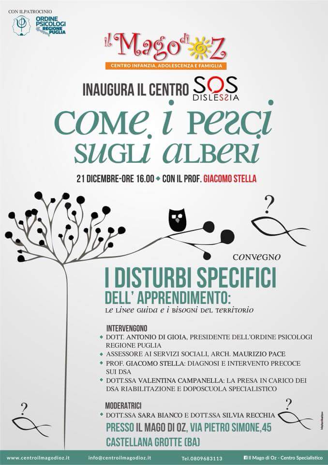 Il 21 dicembre, presso la sede del Centro Infanzia Adolescenza e Famiglia “Il Mago di Oz” di Castellana Grotte, a partire dalle ore 16:00 si terrà il convegno “Come i pesci sugli alberi” , evento patrocinato dall’Ordine degli Psicologi della Regione Puglia e dal Comune di Castellana Grotte.