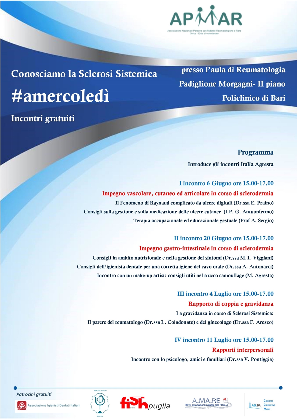 A partire dal 6 giugno si terrà un ciclo di incontri gratuiti organizzati da APMAR (Associazione Nazionale Persone con Malattie Reumatologiche e Rare) presso l’Aula di Reumatologia del Padiglione Morgani del Policlinico di Bari, dal titolo “Conosciamo la Sclerosi Sistemica”.