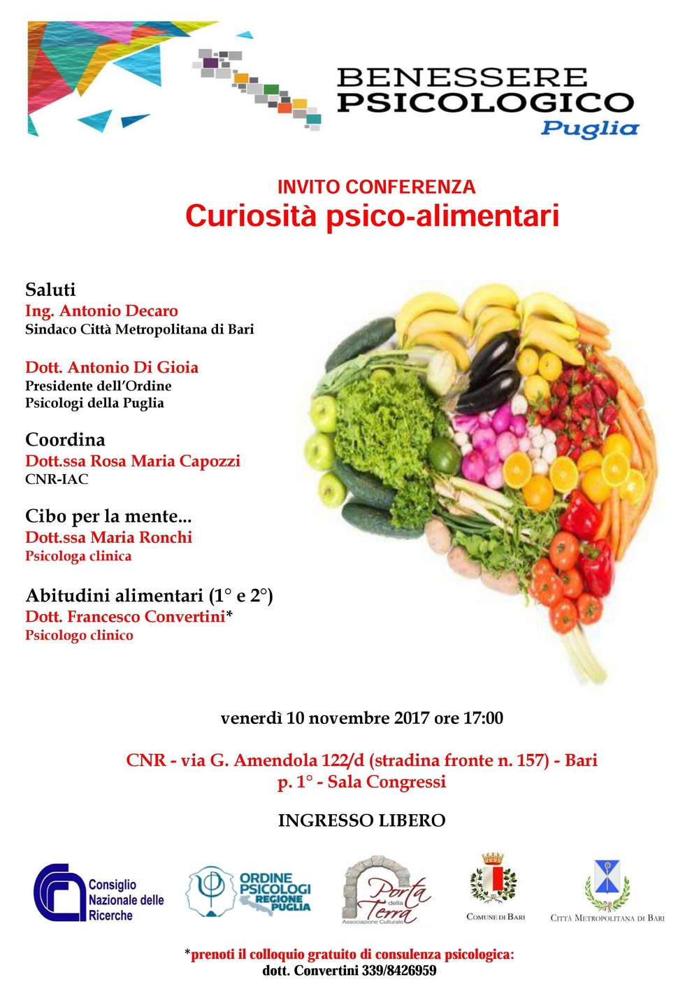 Vi invitiamo a partecipare alla conferenza “Curiosità psico-alimentari” che si terrà dalle ore 17.00 del 10 novembre presso la sede del CNR, organizzatore dell’evento.
