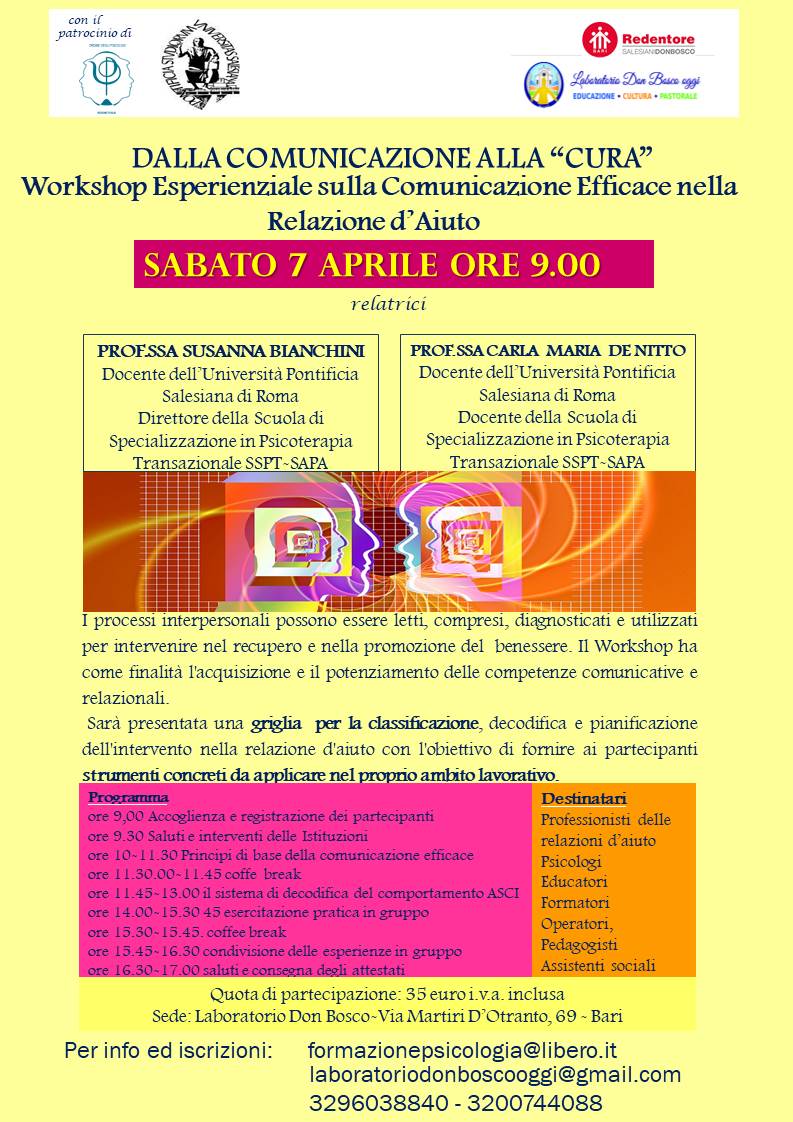 Il 7 aprile 2018 si terrà a Bari “Dalla comunicazione alla cura”, un workshop esperienziale sulla Comunicazione Efficace nella relazione d’aiuto, dalle ore 9.00 alle 17.00 destinato ai professionisti della relazione d’aiuto, Psicologi, Educatori, Formatori, Operatori, Pedagogisti e Assistenti Sociali.