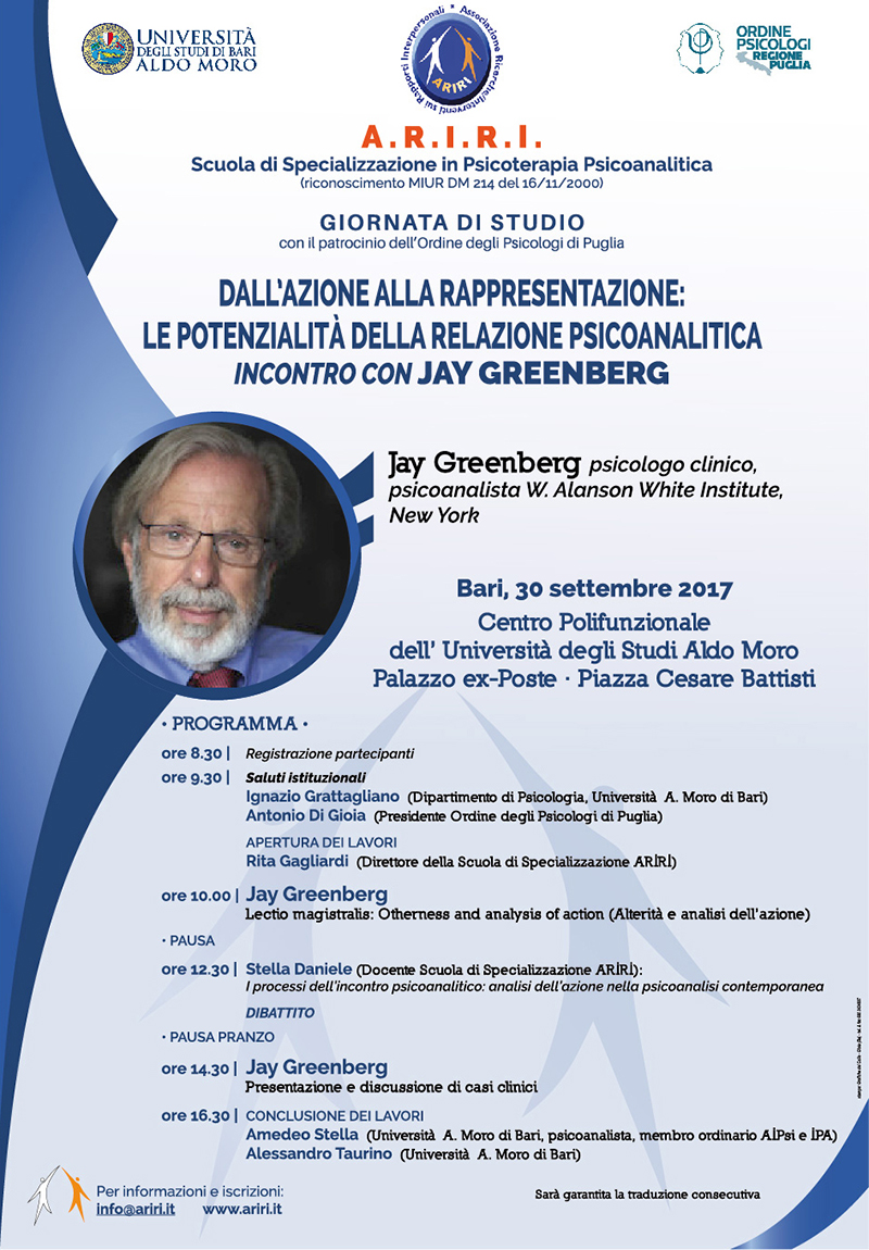 Sabato 30 settembre 2017, presso il Centro Polifunzionale dell’Università degli Studi di Bari “Aldo Moro” sito in p.zza Cesare Battisti (ex palazzo delle Poste), si terrà una giornata di studio con Jay Greenberg, noto psicologo clinico e psicanalista del W. Alanson White Institute di New York.