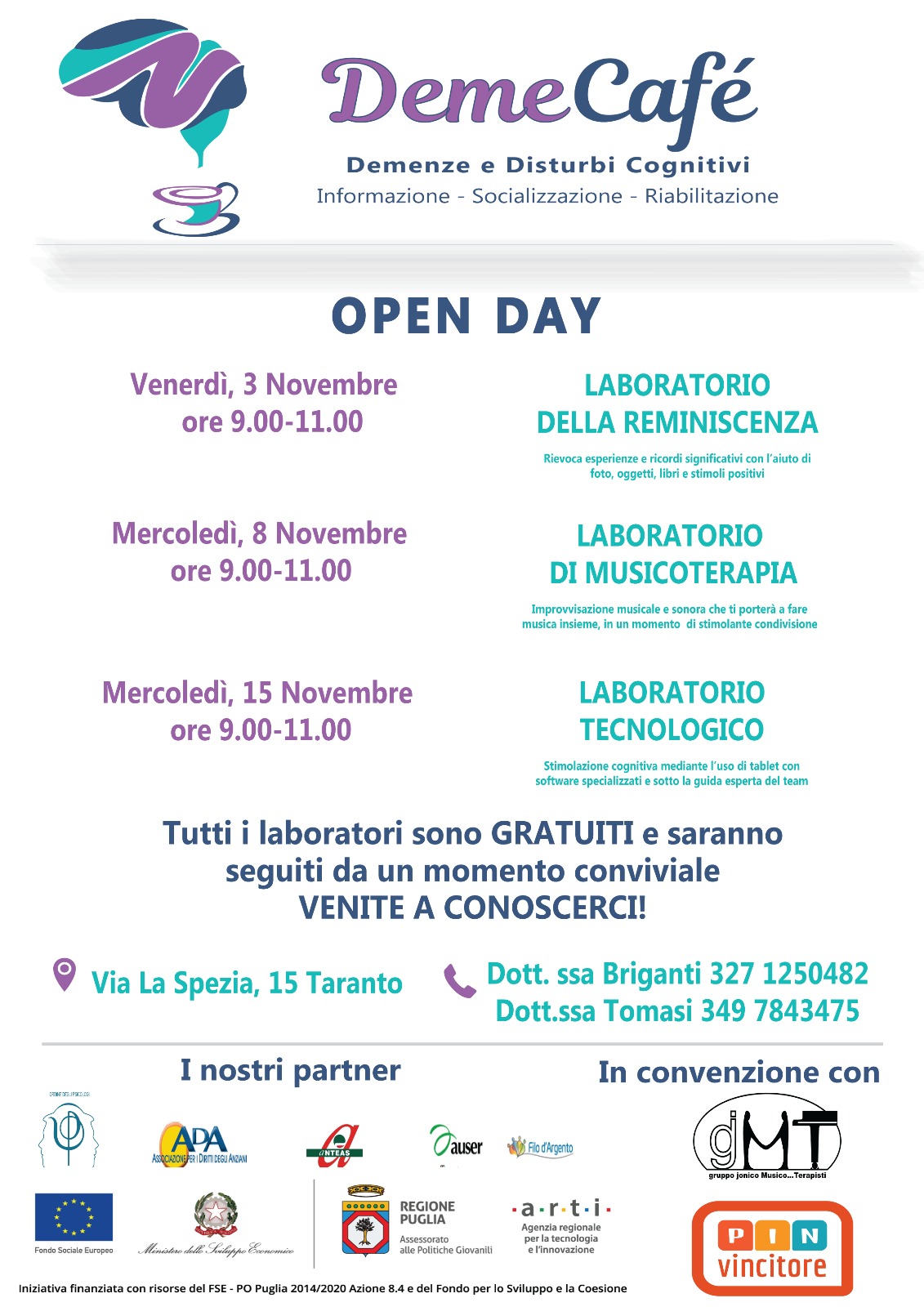 Gli eventi sono patrocinati dall’Ordine degli Psicologi di Puglia, in convenzione con GJMT (Gruppo Jonico Musico Terapisti).