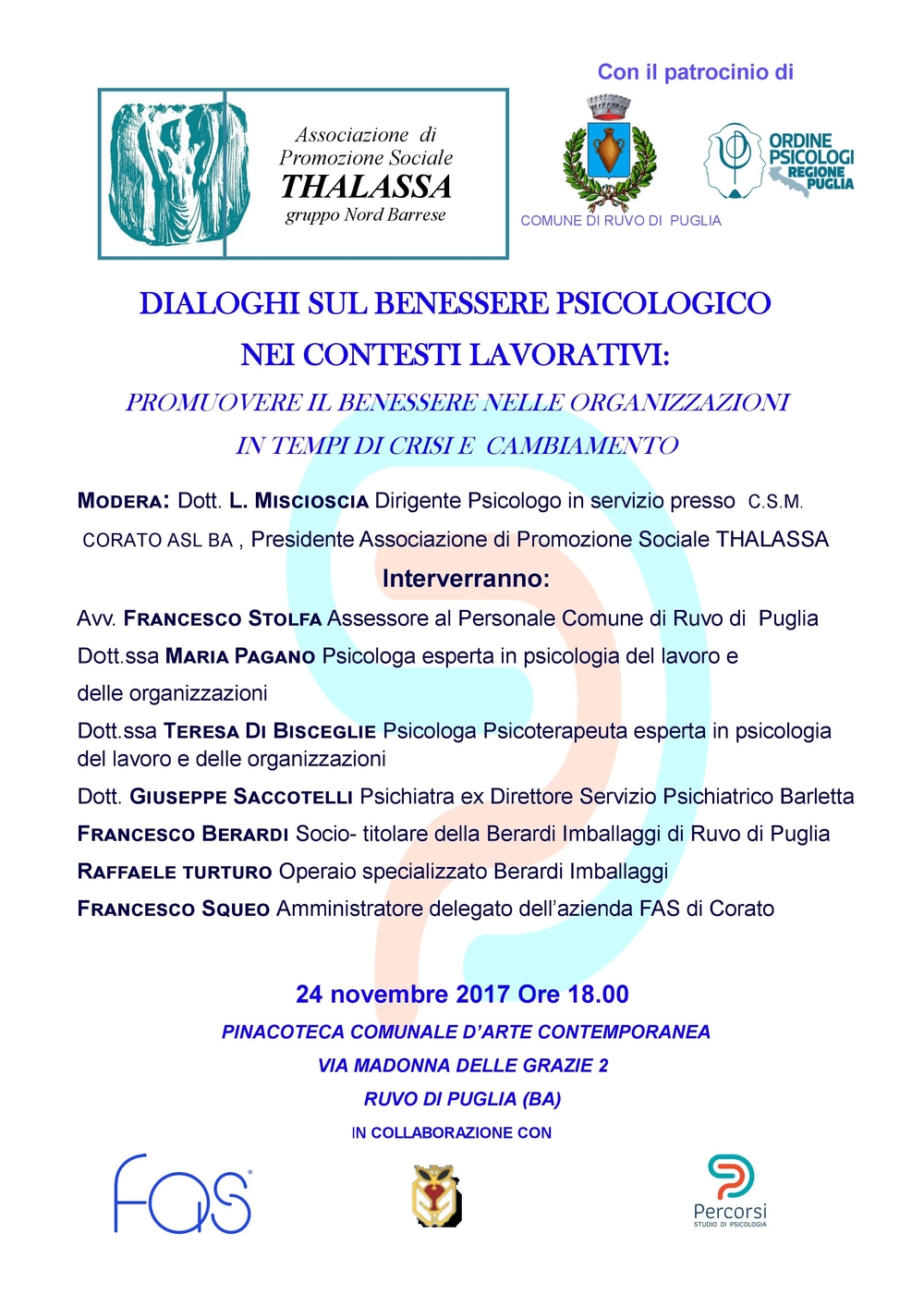 L’Associazione di Promozione Sociale THALASSA, con il patrocinio dell’Ordine degli Psicologi di Bari e il Comune di Ruvo di Puglia, organizza l’evento “Dialoghi sul benessere psicologico nei contesti lavorativi. Promuovere il benessere nelle organizzazioni in tempi di crisi e cambiamento” presso la Pinacoteca di comunale in via Madonna delle Grazie.