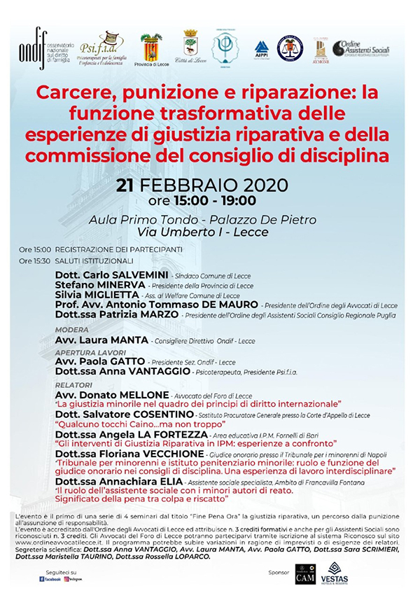 Siamo lieti di invitarvi all’evento patrocinato dall’Ordine degli Psicologi di Puglia dal titolo “Carcere, punizione e riparazione: la funzione trasformativa delle esperienze di giustizia riparativa e della commissione del consiglio di disciplina“, che si terrà il 21 febbraio 2020 a Lecce, presso l’Aula Primo Tondo – Palazzo De Pietro, Via Umberto I, dalle ore 15:00 alle ore 19:00.