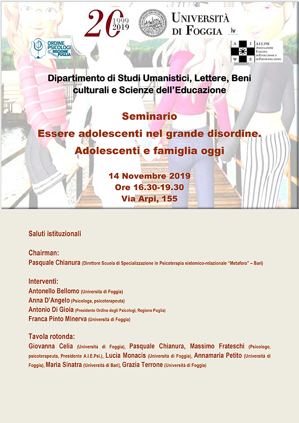 Vi invitiamo al Seminario “Essere adolescenti nel grande disordine. Adolescenti e famiglia oggi”, che si terrà il 14 novembre 2019, presso il Dipartimento di Studi Umanistici, Lettere, Beni Culturali e Scienze dell’Educazione dell’Università di Foggia, dalle ore 16:30 alle ore 19:30.