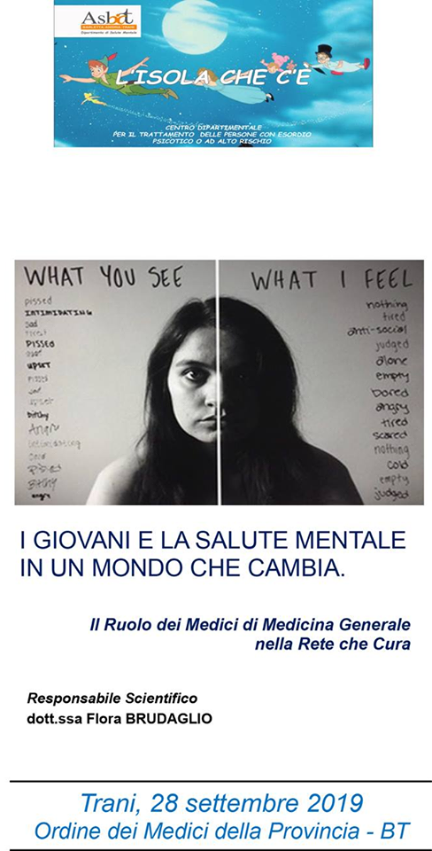 Sabato 28 settembre 2019 si svolgerà il Convegno dal titolo “I GIOVANI E LA SALUTE MENTALE IN UN MONDO CHE CAMBIA. IL RUOLO DEI MMG NELLA RETE CHE CURA”, organizzato dal Dipartimento di Salute Mentale ASL BT, con il patrocinio dell’Ordine degli Psicologi della Regione Puglia.