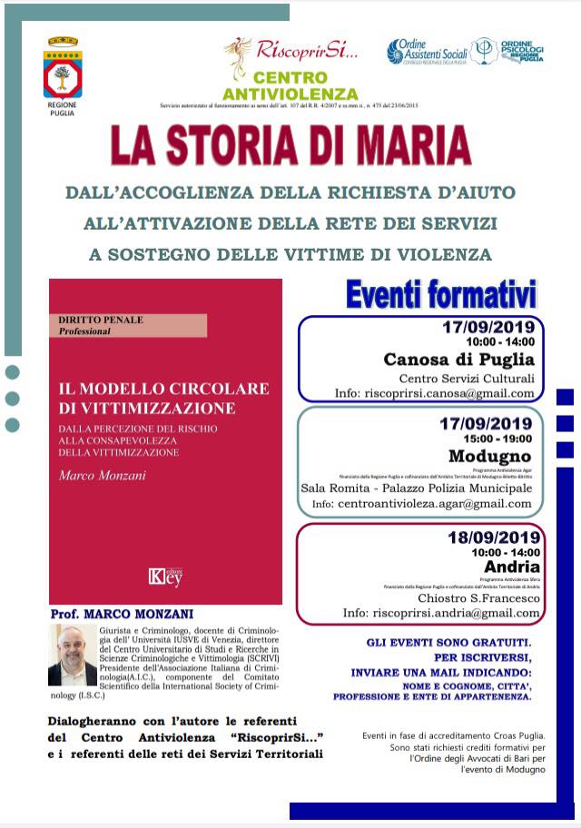 Vi invitiamo a partecipare agli eventi formativi dal titolo “La Storia di Maria – Dall’accoglienza della richiesta d’aiuto all’attivazione della rete dei servizi a sostegno delle vittime di violenza”.