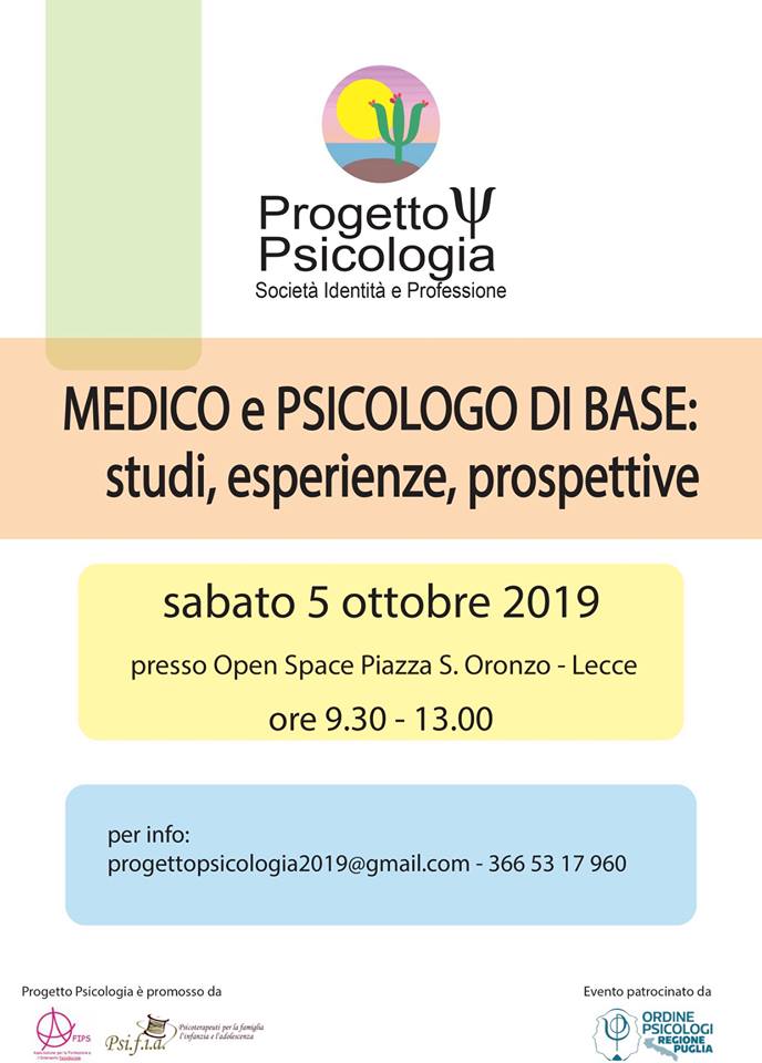 Vi invitiamo all’appuntamento con Progetto Psicologia – Società Identità e Professione Sabato 5 ottobre 2019 dal titolo “MEDICO e PSICOLOGO DI BASE: studi, esperienze, prospettive”, che si svolgerà presso Open Space Piazza S. Oronzo a Lecce, ore 9.30 – 13.00.