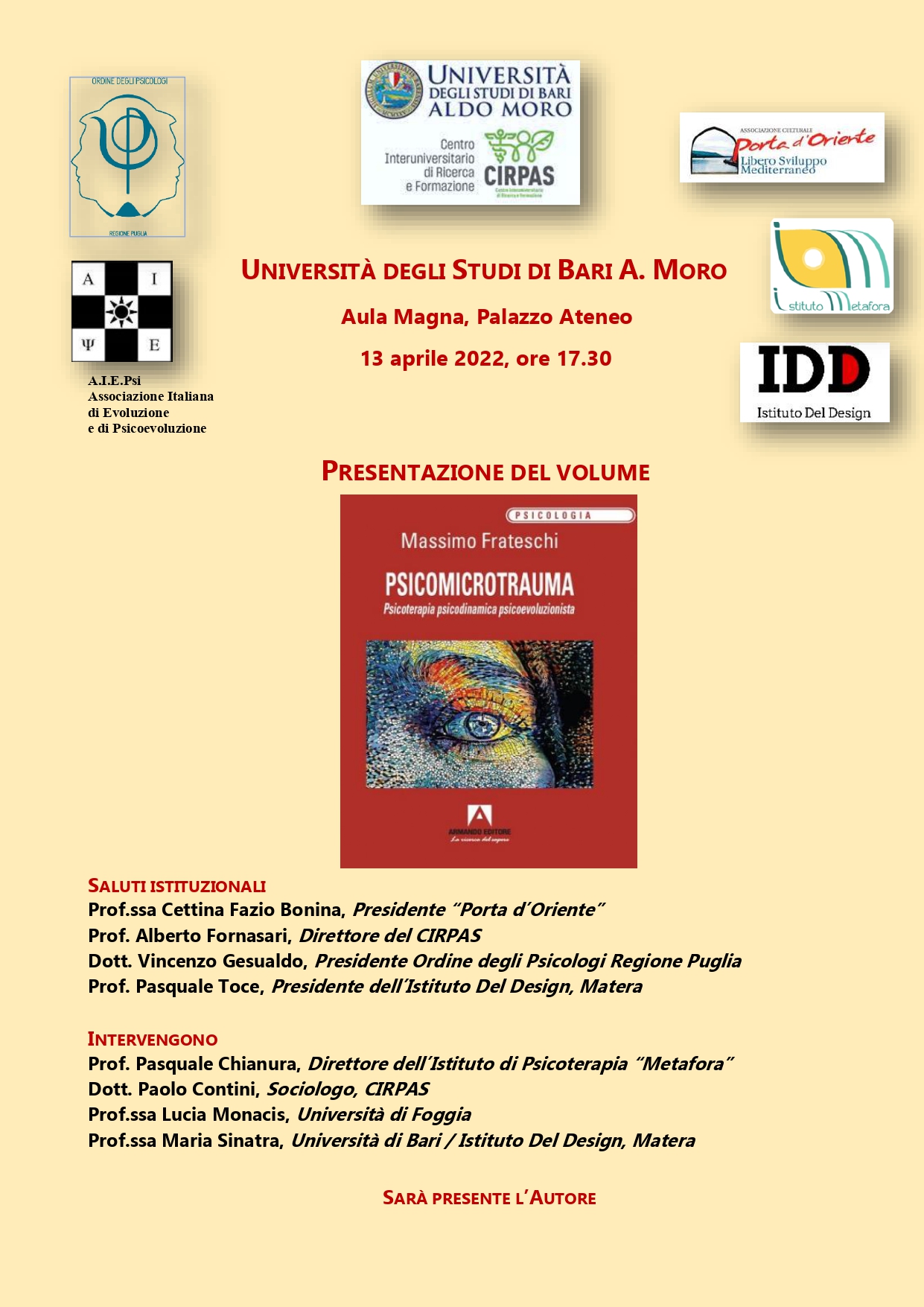 Vi invitiamo all’evento patrocinato dall’Ordine degli Psicologi Puglia: Presentazione del Volume “Psicomicrotrauma, Psicoterapia psicodinamica psicoevoluzionista” di Massimo Frateschi, che si terrà il giorno 13 aprile 2022, presso l’Aula Magna, Palazzo Ateneo dell’Università degli Studi di Bari “Aldo Moro”, Bari.
