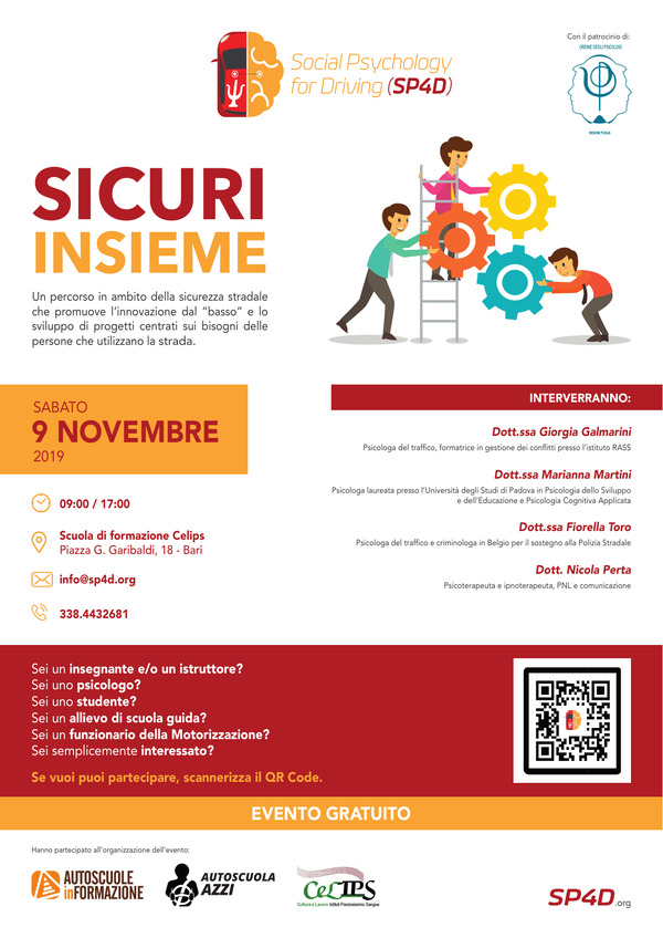 Siamo lieti di invitarvi all’evento patrocinato “Sicuri Insieme” che si terrà sabato 09 novembre 2019 dalle ore 09:00 alle ore 17:00, presso la Scuola di formazione Celips, Bari.