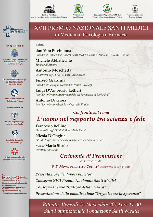 Siamo lieti di invitarvi al XVII PREMIO NAZIONALE SANTI MEDICI di Medicina, Psicologia e Farmacia che si terrà venerdì 15 novembre 2019 alle ore 17.30, presso la Sala Polifunzionale Fondazione Santi Medici, Bitonto.