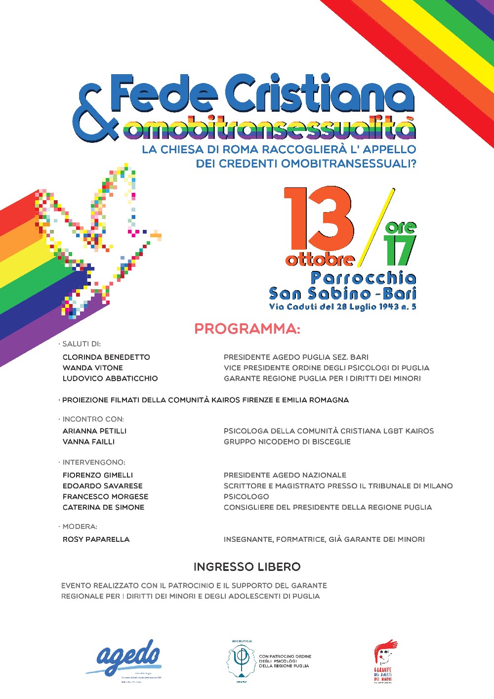 “La Chiesa di Roma accoglierà l’appello dei credenti omobitransessuali?” è la domanda che sarà al centro della tavola rotonda “Fede cristiana e & omobisessualità” organizzata dalla AGedO (Associazione Genitori di Omosessuali) e patrocinata dall’Ordine degli Psicologi della Regione Puglia.