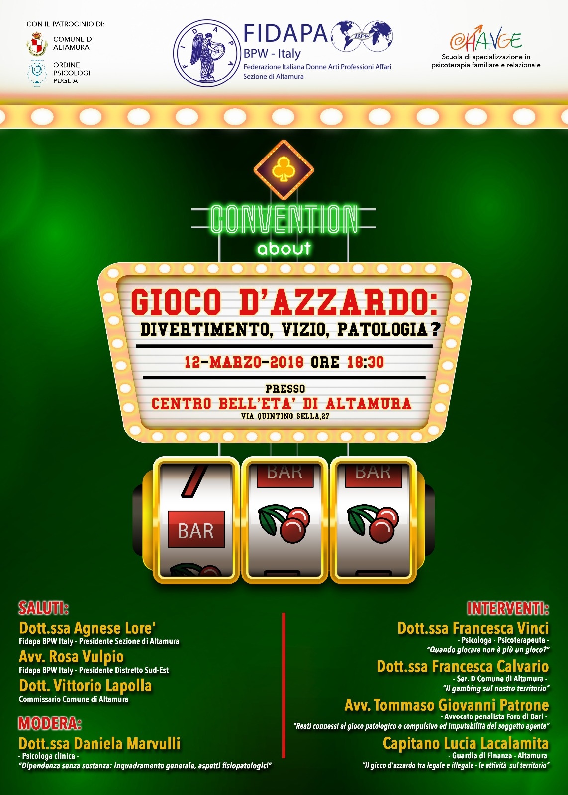 Il 12 marzo p.v. si terrà presso il Centro Bell’età di Altamura la convention “Gioco d’azzardo: divertimento, vizio o patologia?” patrocinato dall’Ordine degli Psicologi di Puglia, dal Comune di Altamura, da FIDAP (Federazione Italiana Donne Arti Professioni Affari) – sezione di Altamura e dalla Scuola Change.