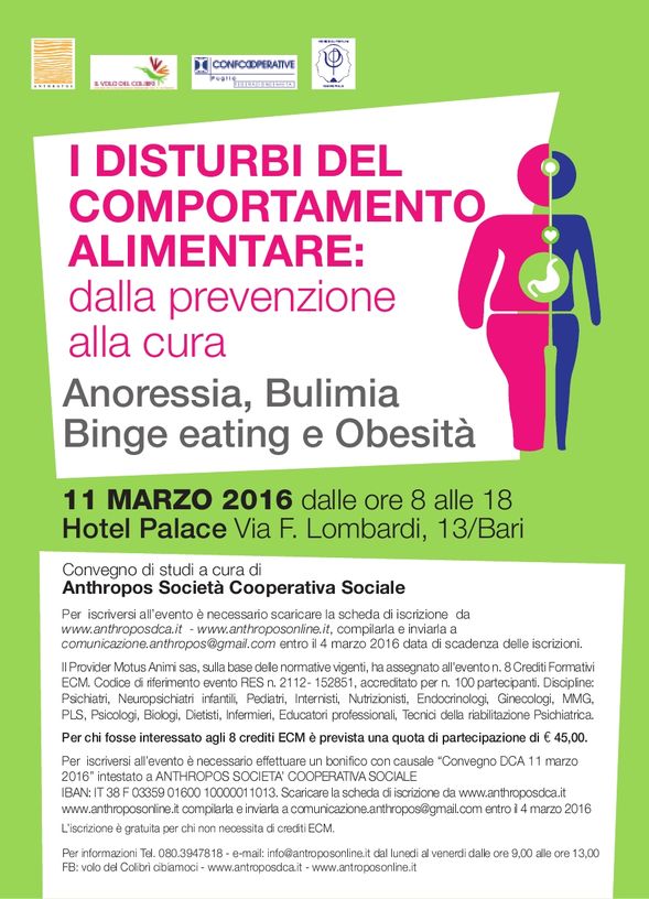 Il seminario è destinato a_ psichiatri, neuropsichiatri infantili, pediatri, internisti, nutrizionisti, endocrinologi, ginecologi, MMG, PLS, psicologi, biologi, dietisti, infermieri, educatori professionali, tecnici della riabilitazione psichiatrica. E ‘ possibile iscriversi richiedendo il riconoscimento di 8 crediti ECM . Codice di riferimento evento RES n. 2112- 152851, accreditato per N. 100 partecipanti. Per iscriversi all’ evento è necessario scaricare la scheda di iscrizione da www.anthroposdca.itwww.anthroposonline.it compilarla e inviarla a comunicazione.anthropos@gmail.com. L’iscrizione è gratuita per chi non necessita di crediti ECM. Scadenza iscrizioni 4 marzo 2016. Per informazioni_ Tel. 080 3947818 – E-mail: info@anthroposonline.it – Facebook: Volo del Colibrì Cibiamoci