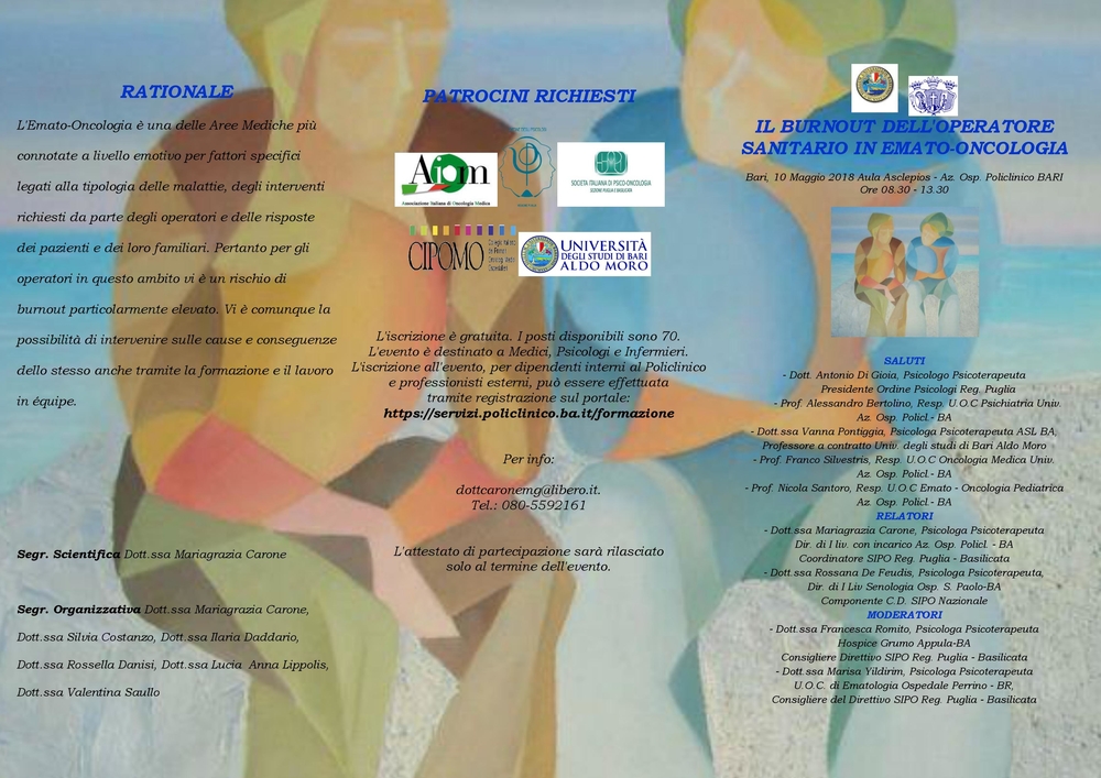 Il 10 maggio p.v. si terrà presso l’aula Asclepios dell’Azienda Ospedaliera Policlinico di Bari, il convegno “Il burnout dell’operatore sanitario in emato-oncologia” patrocinato dall’Ordine degli Psicologi della Regione Puglia.