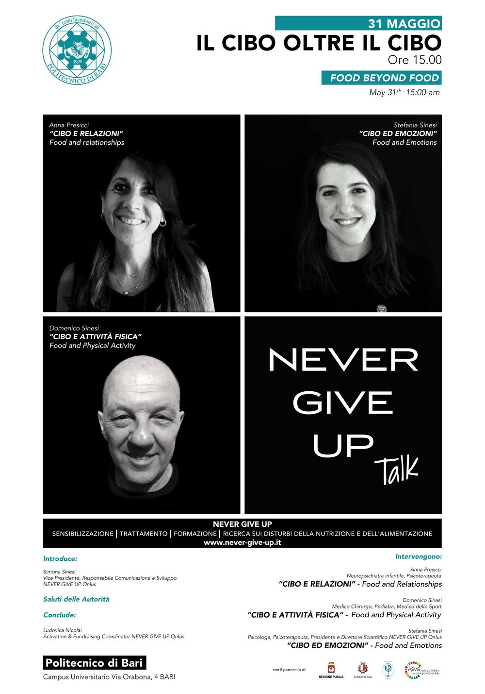L’Ordine degli Psicologi di Puglia patrocina l’evento “Il cibo oltre il cibo – Food beyond Food” di NEVER GIVE-UP che si terrà il 31 maggio 2018 presso il Politecnico di Bari.