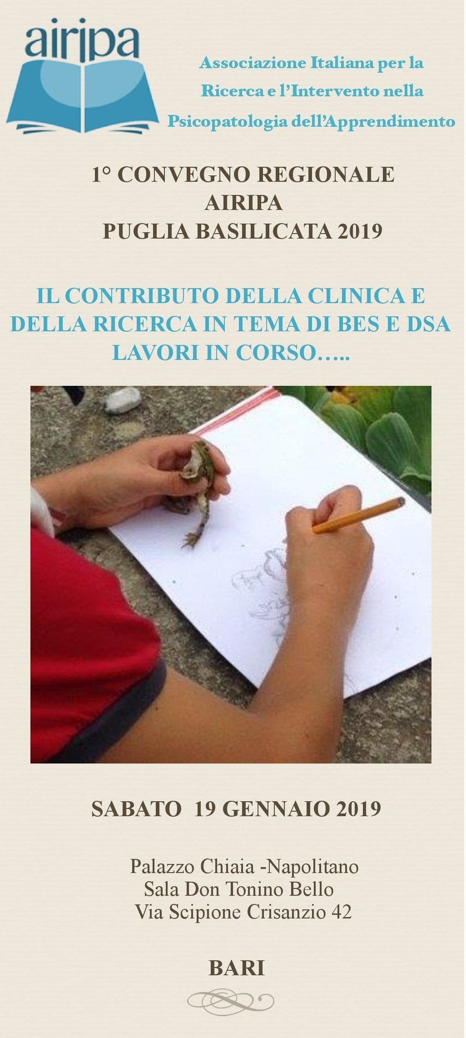 AIRIPA (Associazione Italiana per la Ricerca e l’Intervento nella Psicopatologia dell’Apprendimento) organizza il 1° convegno regionale Puglia Basilicata 2019 con il patrocinio dell’Ordine degli Psicologi di Puglia, dal titolo “Il contributo della clinica e della ricerca in tema di BES e DSA”.
