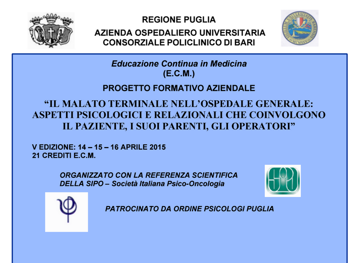dal titolo: “IL MALATO TERMINALE NELL’OSPEDALE GENERALE: ASPETTI PSICOLOGICI E RELAZIONALI CHE COINVOLGONO IL PAZIENTE, I SUOI PARENTI, GLI OPERATORI.