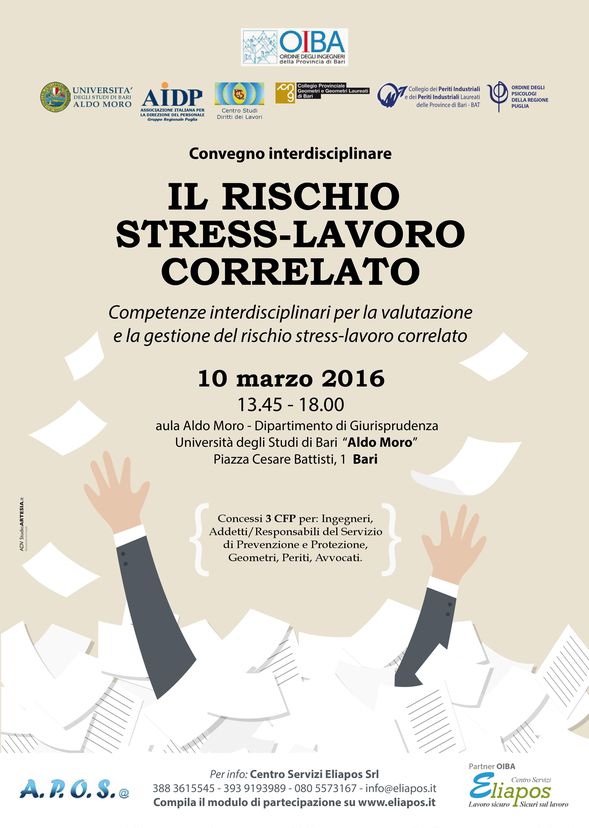 Giovedì 10 marzo, presso l’Aula Aldo Moro dell’Università degli Studi di Bari, il convegno interdisciplinare “IL RISCHIO STRESS LAVORO CORRELATO, competenze interdisciplinari per la valutazione e la gestione del rischio stress-lavoro correlato”.