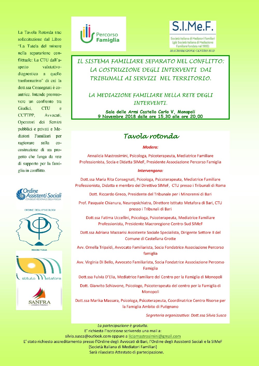 Il 9 novembre 2018, presso la Sala delle Armi del Castello Carlo V di Monopoli, dalle ore 15:30 alle ore 20:00, si terrà la Tavola Rotonda “Il sistema familiare separato nel conflitto: la costruzione degli interventi dai tribunali ai servizi nel territorio. La mediazione familiare nella rete degli interventi”.