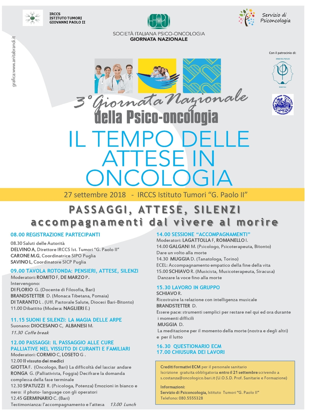 In occasione della 3^ giornata Nazionale della Psico-Oncologia, il 27 settembre si svolgerà il seminario “Il tempo delle attese in Psico-Oncologia – Passaggi, attese, silenzi. Accompagnamenti dal vivere al morire” presso IRCCS Istituto Tumori “G.Paolo II” di Bari.
