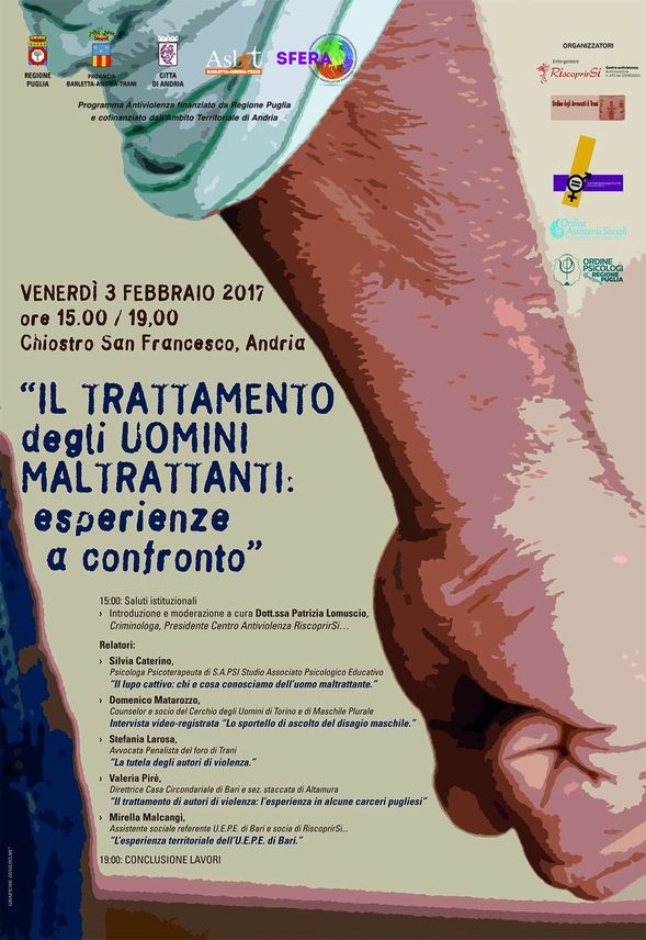 Home > Tutte le News > Eventi > Il trattamento degli uomini maltrattanti... Il trattamento degli uomini maltrattanti: esperienze a confronto Marzo 31, 2017 Evento patrocinato dall’Ordine degli Psicologi di Puglia e organizzato dall’Associazione RiscoprirSi.