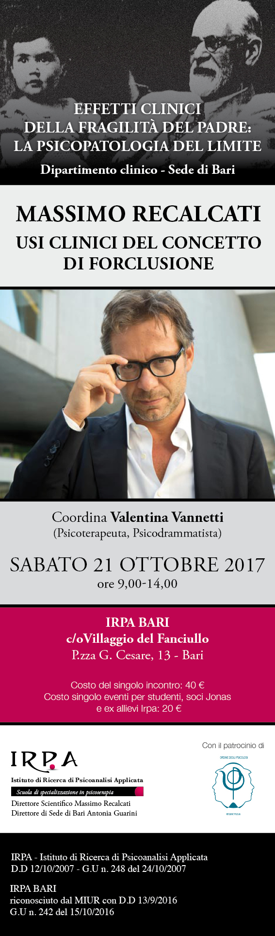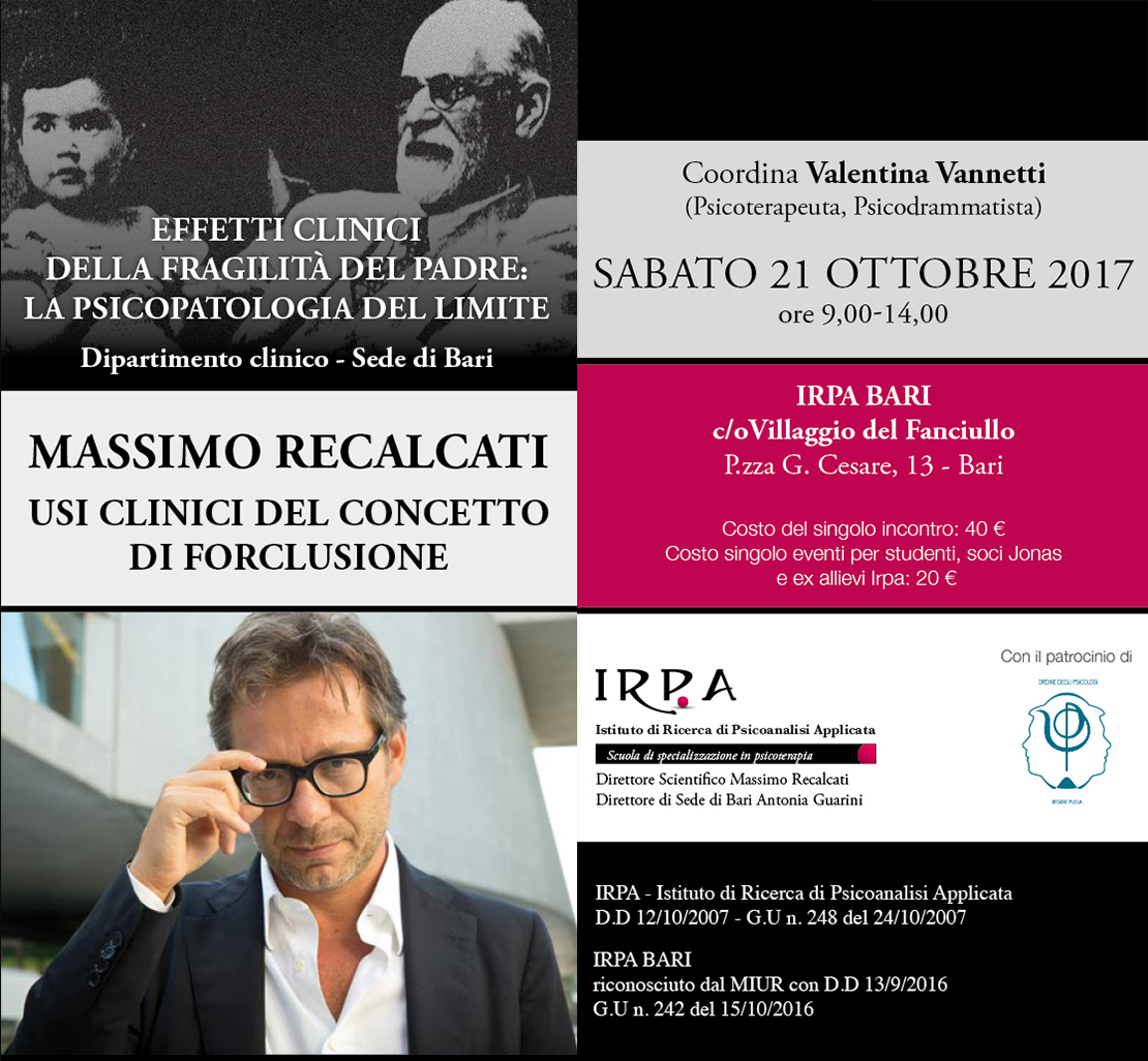 La Scuola di Psicoterapia IRPA organizza un incontro con il dott. Massimo Recalcati all’interno del Dipartimento clinico “Effetti clinici della fragilità del padre: la psicopatologia del limite“. L’intervento di Recalcati verterà su tema degli usi clinici del concetto di forclusione e si terrà sabato 21 ottobre dalle 9.00 alle 14.00 presso il Villaggio del Fanciullo, P.zza Giulio Cesare n°13, a Bari.