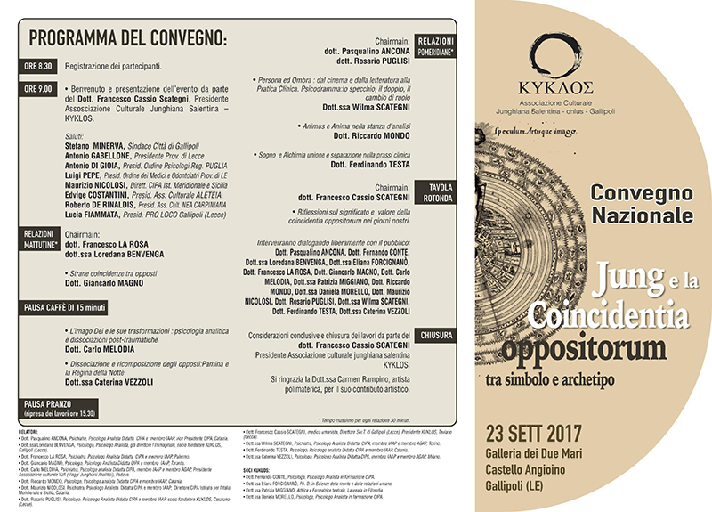 Segnaliamo il Convegno Nazionale “Jung e la Coincidentia oppositorium” organizzato dall’Associazione Junghiana Salentina di Gallipoli e patrocinato dall’Ordine degli Psicologi di Puglia.