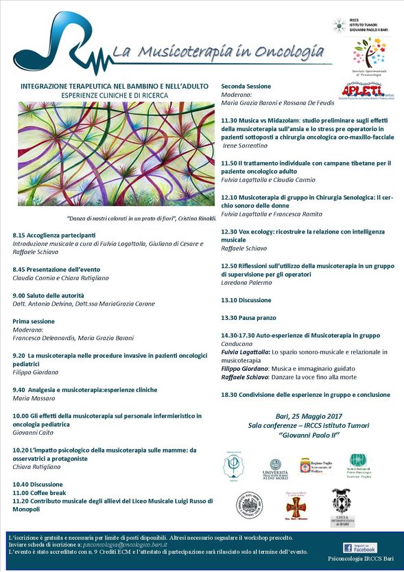 L’evento patrocinato dall’Ordine degli Psicologi della Regione Puglia, “La Musicoterapia in Oncologia: integrazione terapeutica nel bambino e nell’adulto”, sarà occasione per discutere di esperienze cliniche e di ricerca sul tema.