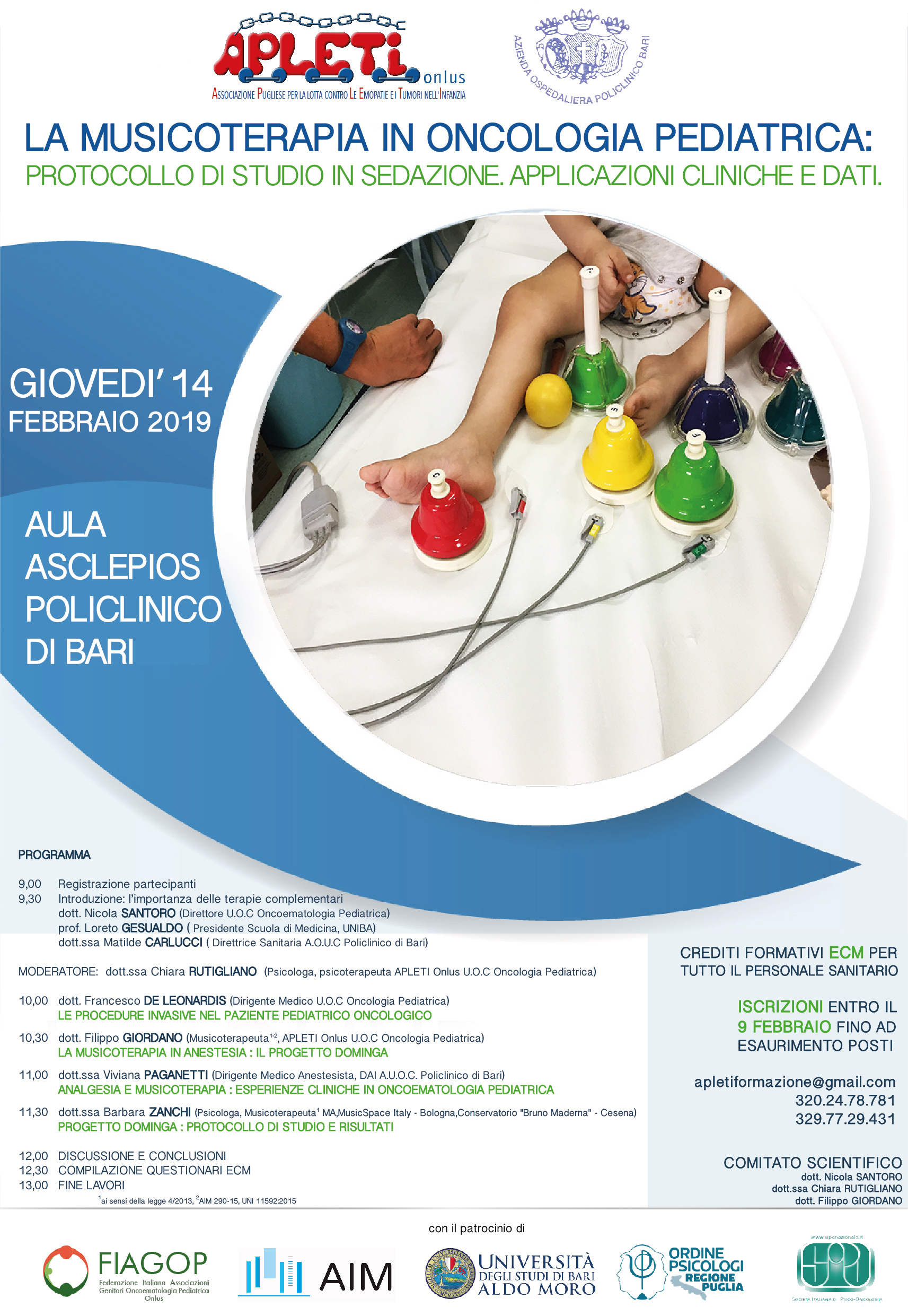 “La musicoterapia in oncologia pediatrica: protocollo di studio in sedazione. Applicazioni cliniche e dati” è il convegno che si svolgerà il 14 febbraio, ore 9-13, presso il Policlinico di Bari, organizzato da APLETI onlus (Associazione Pugliese per la lotta contro le Emopatie e i Tumori nell’Infanzia) e patrocinato dall’Ordine degli Psicologi di Puglia.