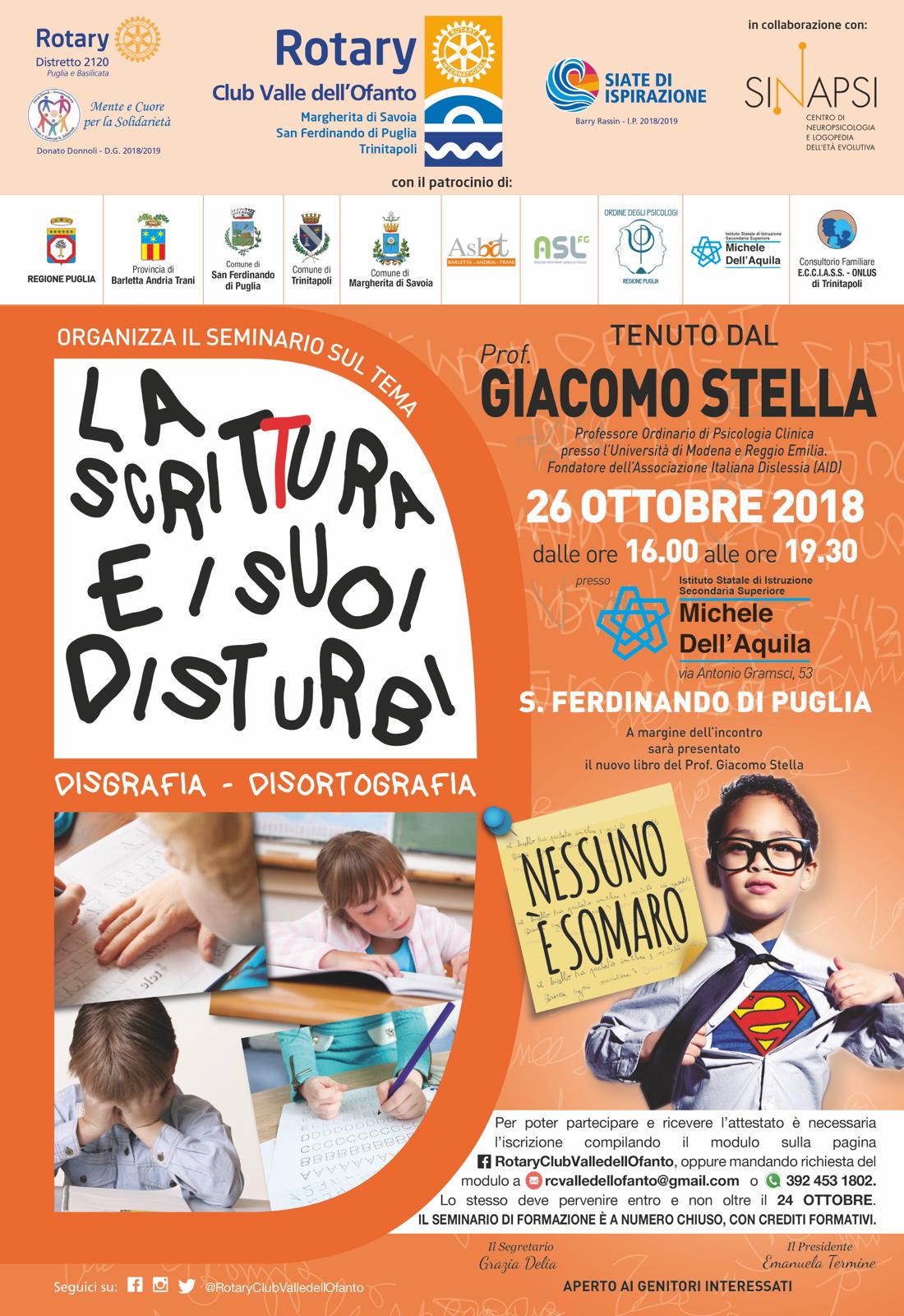 Il Prof. Giacomo Stella terrà il seminario “La scrittura e i suoi disturbi. Disgrafia e disortografia” organizzato dal Rotary Club Valle dell’Ofanto con il patrocinio dell’Ordine degli Psicologi della Puglia.